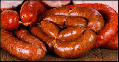 Sausage is a meat product usually made from ground meat, often pork, beef or poultry, along with salt, spices, peppers, cheese and other flavorings.  Some makers use ingredients such as grains or breadcrumbs that may be included as fillers of extenders. The word"sausage" can refer to the loose sausage meat, which can be formed into patties or stuffed into a skin.  When referred to as "a sausage," the product is usually cylindrical and encased in a skin.  Typically, a sausage is formed in a casing traditionally made from intestine, but ore often made from synthetic materials.  Sausages that are sold raw are cooked in many ways, including pan-frying, broiling, barbecuing and smoking.  Some sausages are cooked during processing and the casing may then be removed.  Sausage making is a traditional food preservation technique.  Sausages may be preserved by curing, drying (often in association with fermentation or culturing, which can contribute to preservation), smoking, or freezing.  Some cured or smoked sausages can be stored without refrigeration.  Most fresh sausages must be refrigerated or frozen until they are cooked.  Sausages come in a huge range of national and regional varieties, which differ by their flavoring or spicing ingredients (garlic, peppers, wine, etc.), the meat(s) used in them and their manner of preparation.